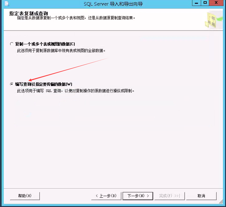 三、指定表复制或查询选项里,选择“编写查询以指定要传输的数据”