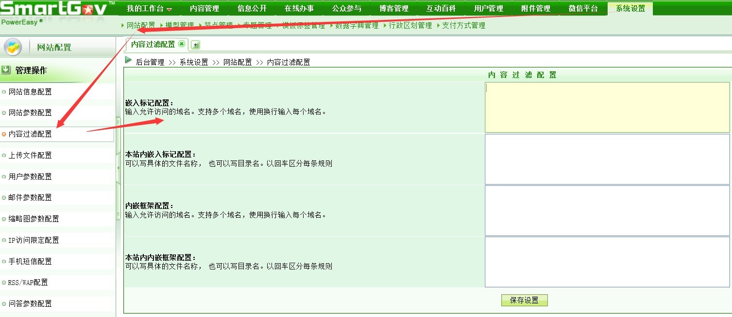 siteFactory6.1版本增加了内容过滤功能,将授权的域名加入受信任的嵌入标记配置中,可以让使用这些域名地址、本站路径的flash、视频等文件(采用embed 或 iframe标记),不被系统安全组件过滤,在前台正常的播放和显示;可以根据需要在系统设置--网站配置--内容过滤配置,具体如下图: