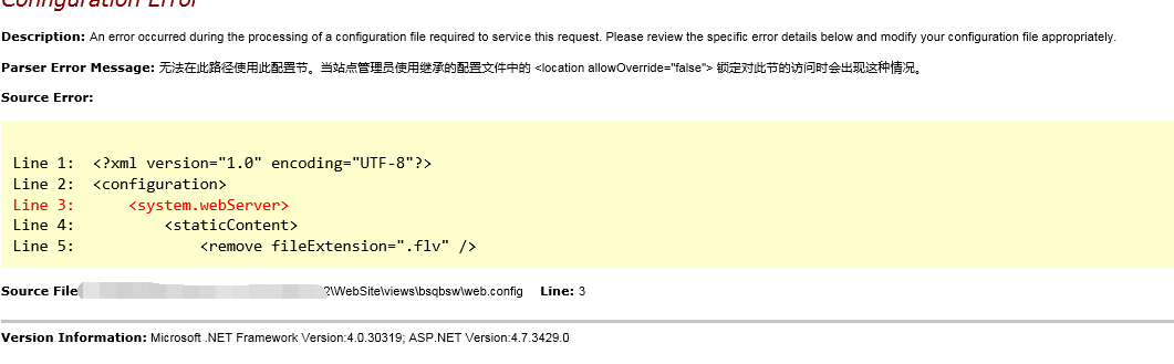 问题:网站访问提示无法在此路径使用配置节问题,如下图 :