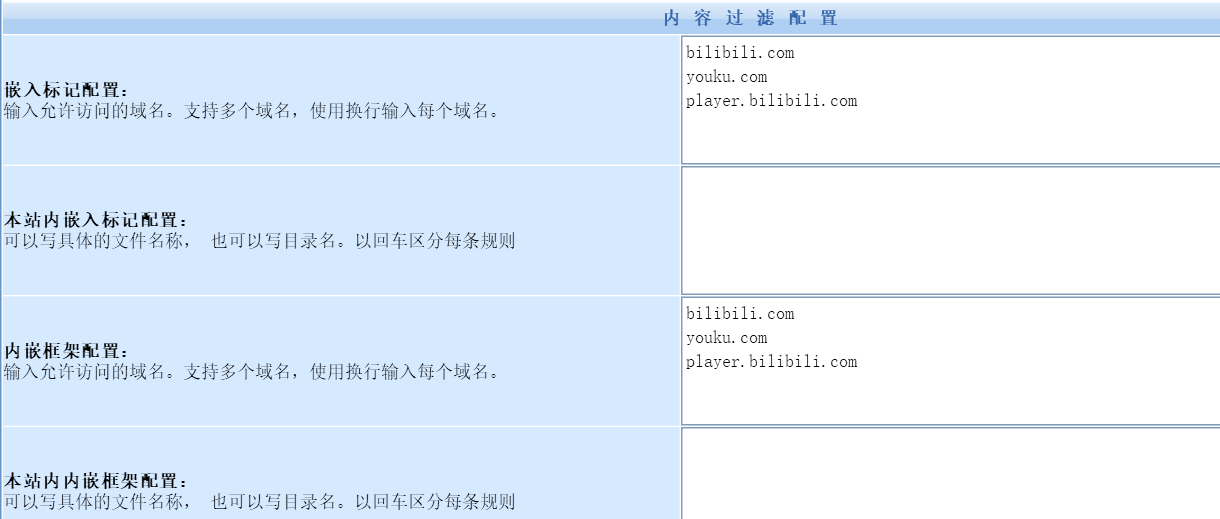 在系统设置-网站管理-内容管理过滤配置下 进行嵌入编辑配置 中加入相关域名