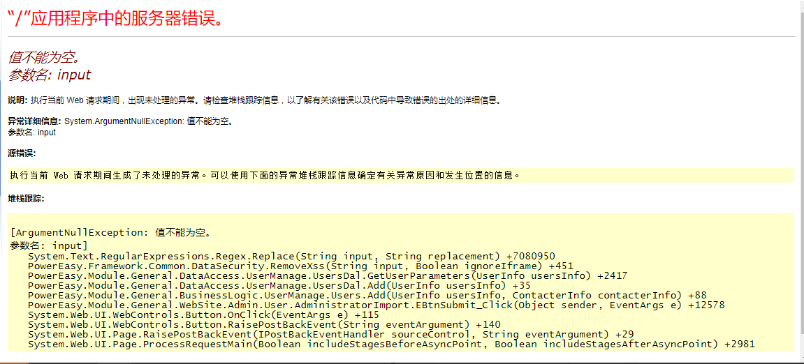 问题:批量导入管理员的时候提示"值不能为空,参数名input",报错如下图 原因:上传的xlsx值里面没有判断空的值 解决办法:覆盖压缩包里面的问题,覆盖前请备份文件 修复RemoveXss方法报错