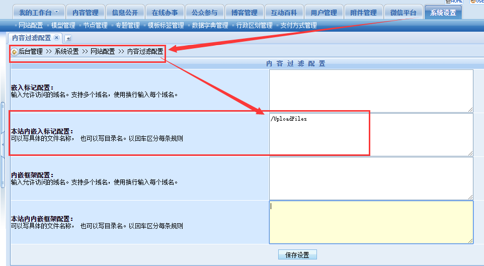 我们可以使用系统预置的内容过滤配置的本站内嵌入标记配置来进行过滤。