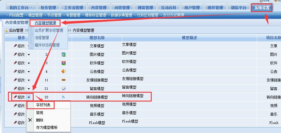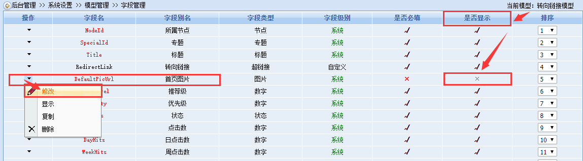 在字段列表,看到有“首页图片”字段存在,只是处于不显示的状态,点操作栏的倒三角的修改按钮,进入字段修改页面。