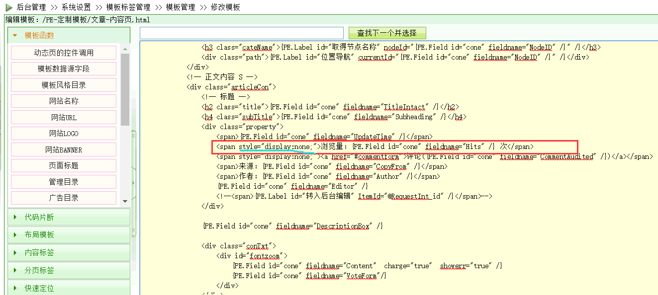 需求描述:客户要求网站在前台浏览时内容页中不显示浏览量统计,但后台要能正常统计。