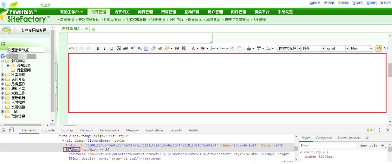 解决方案:进入【系统设置】-【模型管理】-【内容模型管理】,找到文章模型的内容字段(content),修改编辑器宽高即可,正常宽度为600px。