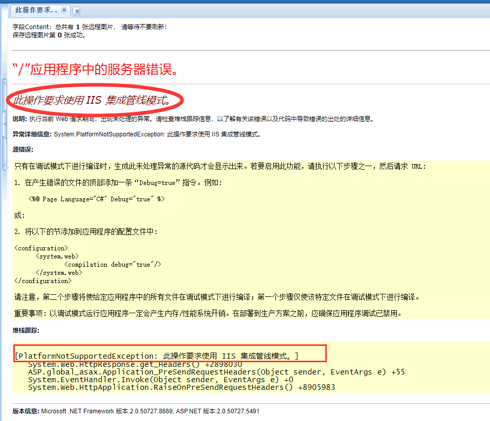 问题描述:文章上传图片时,报“此操作要求使用 IIS 集成管线模式”