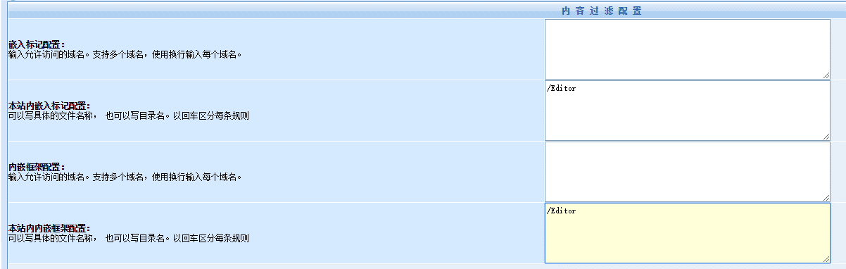<p style="text-indent:2em;">某篇文章前台显示正常,后台编辑器中源码却显示为空,效果如下图:</p> <p align="center"><img align="" alt="" border="0" height="497" src="$/History/tech/uploadfiles/help/2020/6/202006012225309374.png" width="800" /></p> <p align="center"><img align="" alt="" border="0" height="619" src="$/History/tech/uploadfiles/help/2020/6/202006012225475175.png" width="800" /></p> <p style="text-indent:2em;">解决方法:系统设置--内容过滤配置中添加如下图的/Editor(或者其他被过滤的地址)即可。</p> <p align="center"><img align="" alt="" border="0" height="254" src="$/History/tech/uploadfiles/help/2020/6/202006012227398641.png" width="800" /></p>
