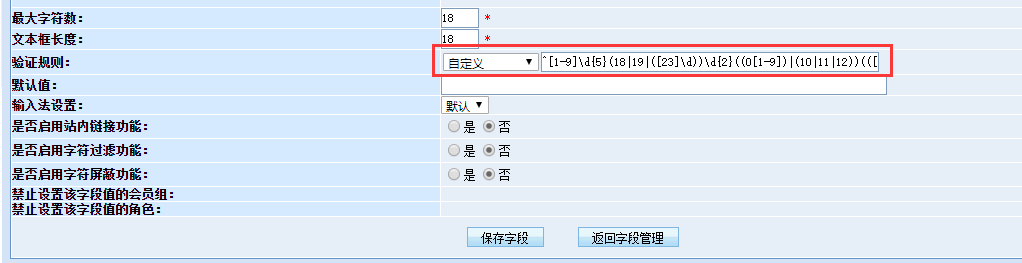 解决方案:表单中身份证验证字段的验证规则选择自定义,^[1-9]d{5}(18|19|([23]d))d{2}((0[1-9])|(10|11|12))(([0-2][1-9])|10|20|30|31)d{3}[0-9Xx]$