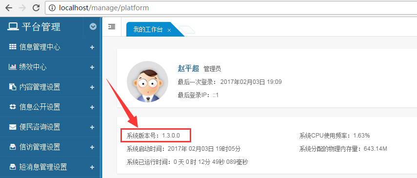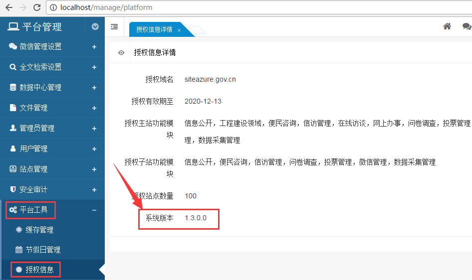 SiteAzure的授权文件到期后,在服务器本地,仍能通过 + 后台路径地址 打开网站后台,登入网站后台后,在平台管理的欢迎页或平台管理下的平台工具>授权信息里查看到版本号,如下图所示: