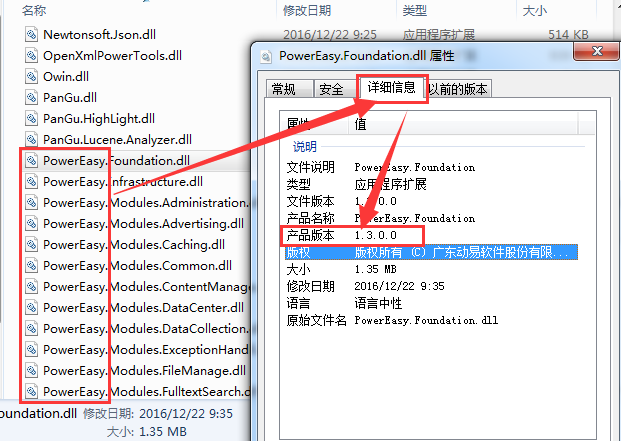 在网站根目录下的BIN文件夹里,以PowerEasy开头的DLL文件,查看其属性,选择“详细信息”选项卡,里面也标注了产品的版本号,在不方便进入网站后台时,用这方法查看系统的版本号尤为方便。