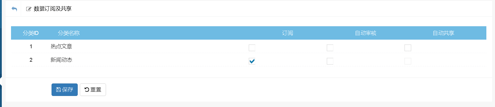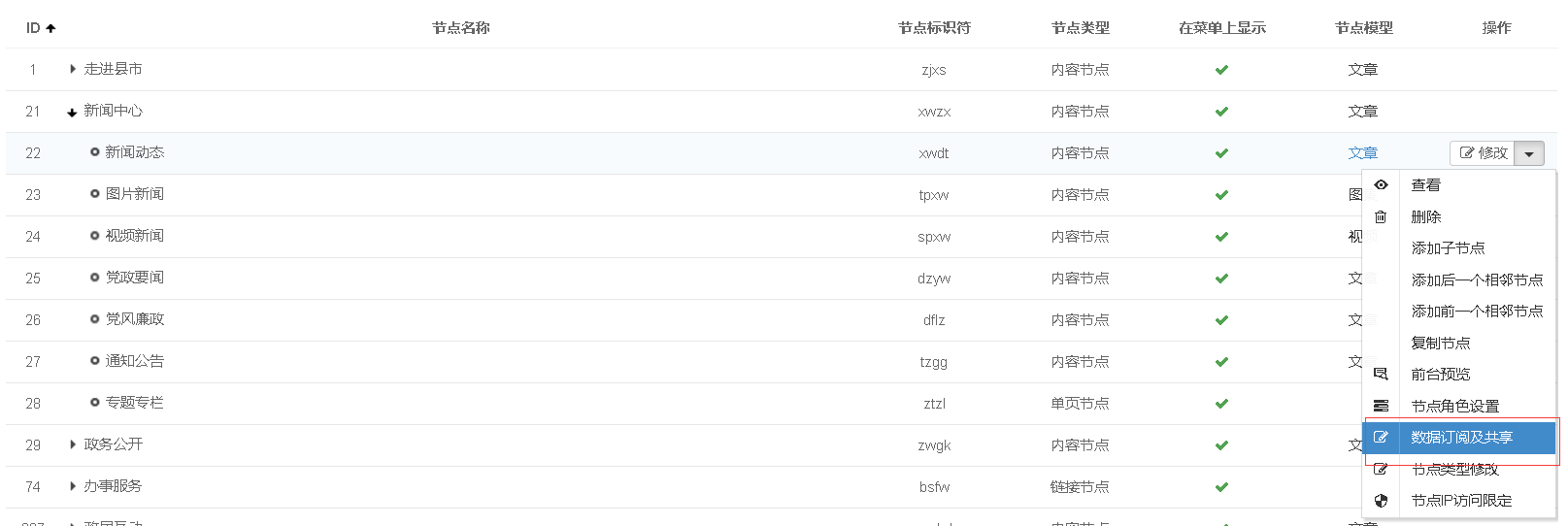 下一步,来到主站中,内容管理—节点管理—找到对应的节点,如“新闻动态”,选择数据订阅及共享按钮: