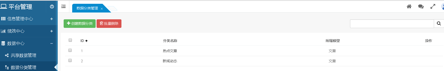 首先在平台管理—数据中心—数据分类管理—创建数据分类(对应主站的栏目名称);