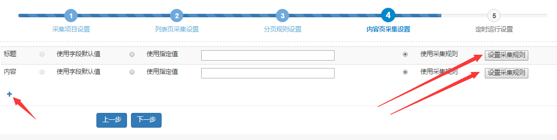 点击设置采集规则进行各个字段的采集规则设置。如果还需要采集内容来源,发布时间之类的字段可以点击左侧的加号,进行需要采集的字段增加。