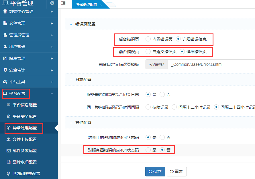 2、如下图设置:平台管理-平台配置-异常处理配置,将前后台错误页设为详细错误,对服务器错误响应404状态码选否。配置完成后,再刷新出错的页面,即能看到详细的错误信息了。