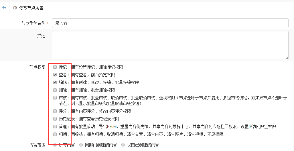 问题:网站1.3升级1.4导致原先角色权限失效 分析:这是由于升级上来带有的bug,那么只能手动进行排查 解决:节点角色里面相关权限并没有勾选 ,重新勾选即可 如图