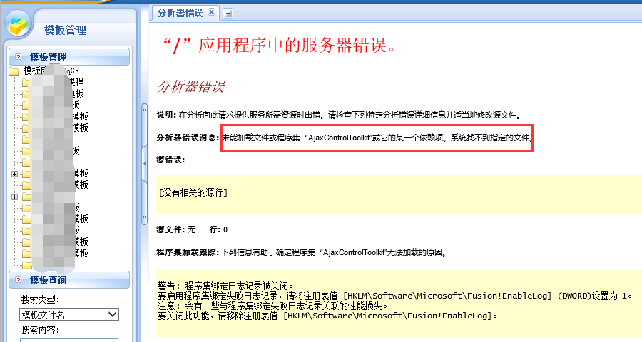 问题描述:后台打开模板,提示“应用程序中的服务器错误”,具体如下图: