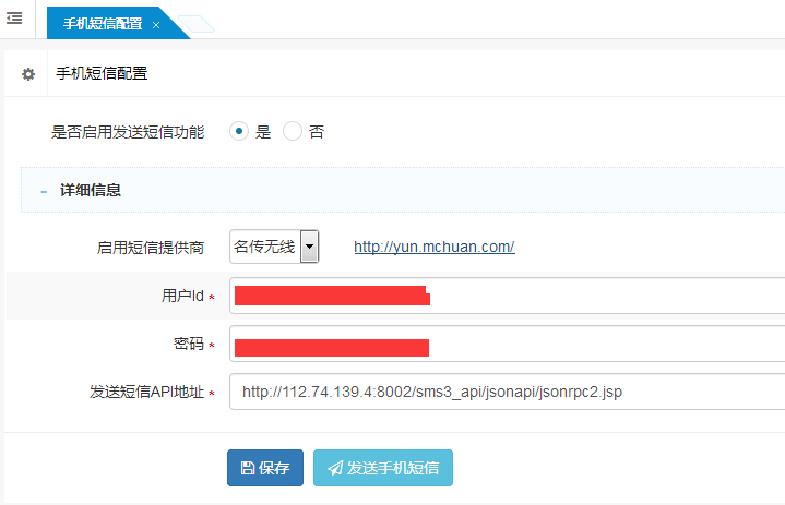 申请通过后,缴费充值后,即可将名传无线的账号、密码、接口地址配置在平台管理-平台配置-手机短信配置中,如下图所示: