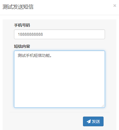 配置成功后,可点击“发送手机短信”按钮,测试配置信息是否正确,功能使用是否正常。如下图所示: