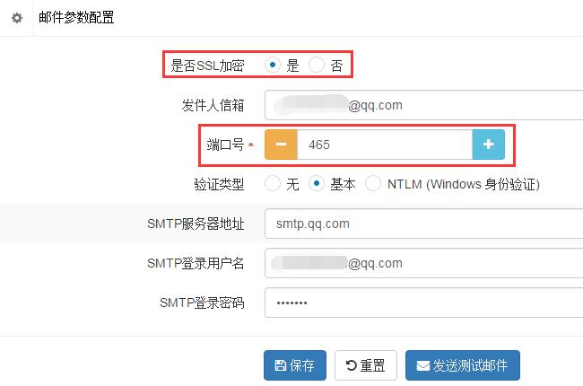 二、按邮箱的SMTP配置指引,在平台管理-平台配置-邮件参数配置,将邮箱服务商提供的配置信息、账号、密码等配置进去,这里注意,部份邮箱,如QQ邮箱支持SSL加密的,需启用加密功能提高通讯安全性,加密通讯端口通常为465,如下图所示,配置完成后,可点击发送测试邮件按钮,尝试发送邮件,如能正常收到,则说明配置成功。
