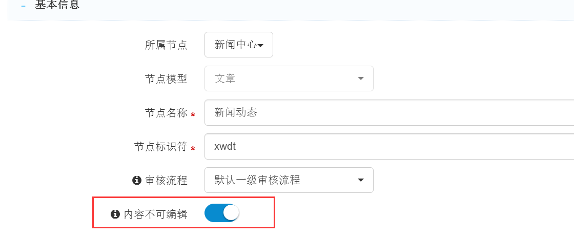 通过依次点击"内容管理"----“节点管理”---选择对应的节点---“修改内容节点”---启用"内容不可编辑”即可,如下图:
