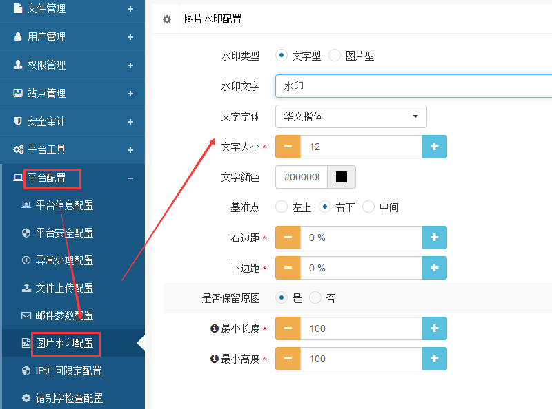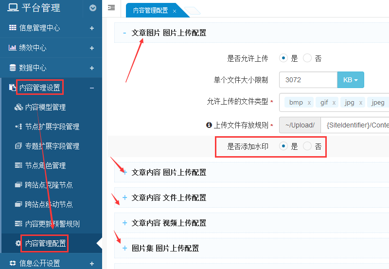 2、模型字段开启水印,进入内容管理设置—内容管理配置,点开各个字段,将需要添加水印的字段,设置为“是”