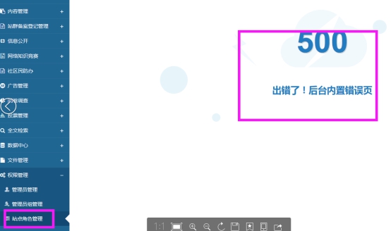 <p class="MsoNormal" style="margin: 0pt"><span style="font-size: 10.5pt; font-family: 宋体; mso-spacerun: " yes";="" mso-ascii-font-family:="" calibri;="" mso-hansi-font-family:="" mso-bidi-font-family:="" "times="" new="" roman";="" mso-font-kerning:="" 1.0000pt"=""><font face="宋体">问题:配置站点角色管理提示</font>500<font face="宋体">后台内置错误页,如下图:</font></span><span style="font-size: 10.5pt; font-family: 宋体; mso-spacerun: " yes";="" mso-ascii-font-family:="" calibri;="" mso-hansi-font-family:="" mso-bidi-font-family:="" "times="" new="" roman";="" mso-font-kerning:="" 1.0000pt"=""> </span></p> <p class="MsoNormal" style="margin: 0pt"><img height="328" src="$/History/tech/uploadfiles/2017/9/201709301421318770.jpg" width="554" /><span style="font-size: 10.5pt; font-family: Calibri; mso-spacerun: " yes";="" mso-bidi-font-family:="" "times="" new="" roman";="" mso-font-kerning:="" 1.0000pt;="" mso-fareast-font-family:="" 宋体"=""> </span></p> <p class="MsoNormal" style="margin: 0pt"><span style="font-size: 10.5pt; font-family: 宋体; mso-spacerun: " yes";="" mso-ascii-font-family:="" calibri;="" mso-hansi-font-family:="" mso-bidi-font-family:="" "times="" new="" roman";="" mso-font-kerning:="" 1.0000pt"=""><font face="宋体">问题分析与解决办法:后台修改异常提示记录,如下图</font></span><span style="font-size: 10.5pt; font-family: 宋体; mso-spacerun: " yes";="" mso-ascii-font-family:="" calibri;="" mso-hansi-font-family:="" mso-bidi-font-family:="" "times="" new="" roman";="" mso-font-kerning:="" 1.0000pt"=""> </span></p> <p class="MsoNormal" style="margin: 0pt"><img height="285" src="$/History/tech/uploadfiles/2017/9/201709301421314437.jpg" width="553" /><span style="font-size: 10.5pt; font-family: Calibri; mso-spacerun: " yes";="" mso-bidi-font-family:="" "times="" new="" roman";="" mso-font-kerning:="" 1.0000pt;="" mso-fareast-font-family:="" 宋体"=""> </span></p> <p class="MsoNormal" style="margin: 0pt"><span style="font-size: 10.5pt; font-family: 宋体; mso-spacerun: " yes";="" mso-ascii-font-family:="" calibri;="" mso-hansi-font-family:="" mso-bidi-font-family:="" "times="" new="" roman";="" mso-font-kerning:="" 1.0000pt"=""><font face="宋体">然后重新访问,查看具体报错提示,再来根据具体提示排查问题。</font></span></p>