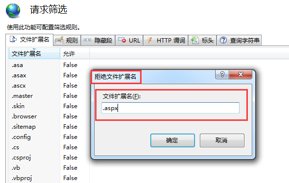 动易的全新架构SiteAzure基于先进的新一代.Net和MVC架构,已经不再像传统技术的网站那样,执行index.aspx、index.php之类的脚本文件了,那么,我们就可以通过禁用.aspx、.php等可执行文件的后缀(扩展名)来实现抵御常规网页脚本木马的植入和运行。如下图所在,在IIS的请求筛选下,拒绝像.aspx等扩展名,即能达到防止后缀为aspx的网页脚本木马运行的效果。