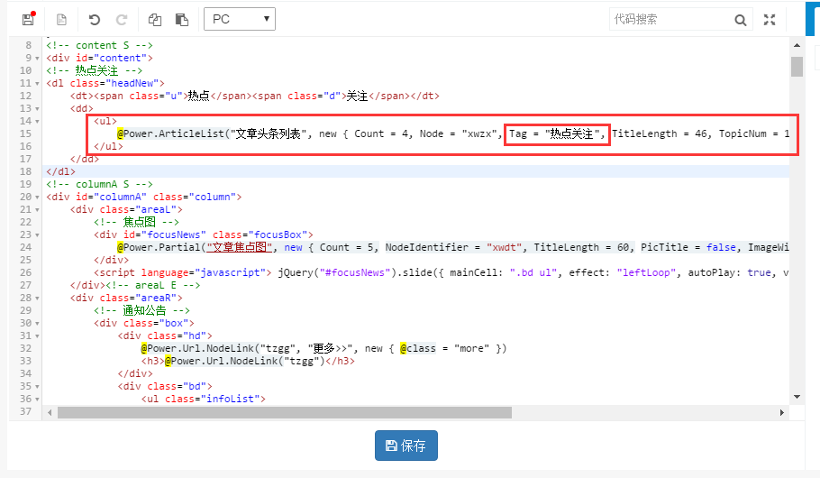 如下图中所示的“热点关注”,其模板调用的即是后台标记为“热点关注”的文章。