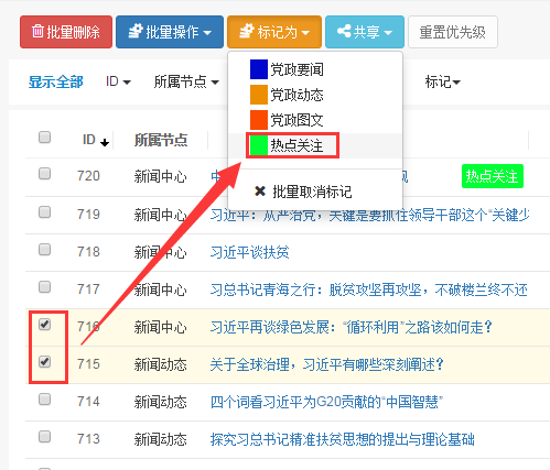 在后台,对信息进行标记操作也很方便,只需勾选中相应的文章后,然后在“标记为”菜单中点选特定标记名称即可。如下图所示: