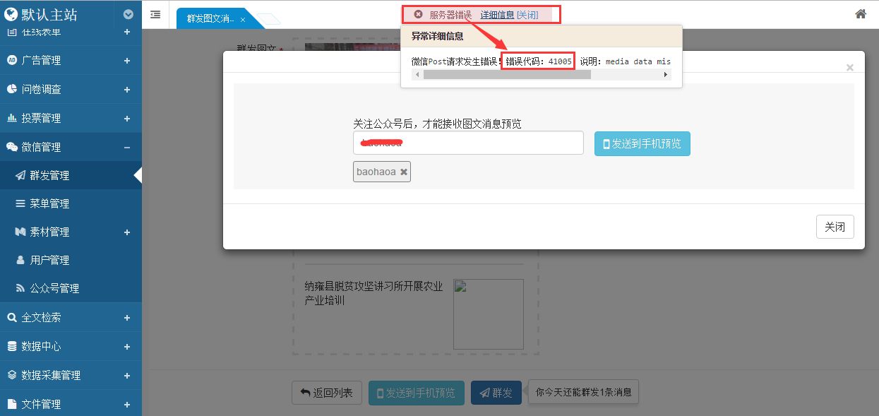 解决方案:根据上面分析,注意到预览的微信图文信息,图片存在破损的情况。重新上传图片,使之可以正常显示,微信图文消息预览报错的问题就得以解决。