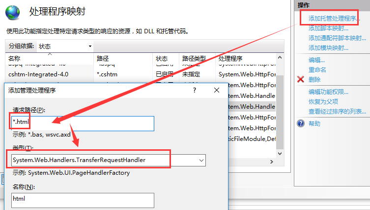 1、先在iis打开网站的处理程序映射,添加映射让.html也是用Asp.Net4.0来解析,如图:请求路径为*.Html,类型为System.Web.Handlers.TransferRequestHandler。