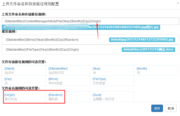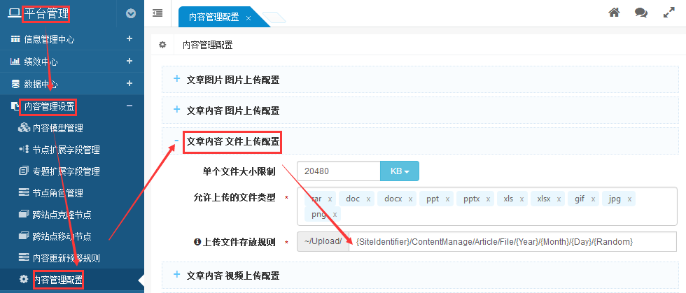 问题解决:平台中心--内容管理设置--内容管理配置--展开“文章内容 文件上传配置”,点击上传文件存放规则,进入配置页面。
