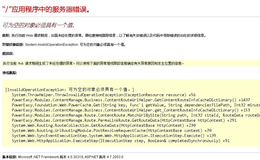 问题: sa中文章内容无法打开提示:应用程序中服务器错误 可为空的对象必须具有一个值 解决:检查栏目节点是否绑定有相关模型