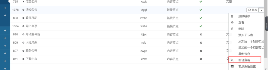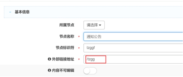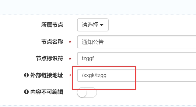 检查发现通知公告(标识符为tzgg)所在的父栏目为信息公开(标识符为xxgk),所以正确的链接路径为/xxgk/tzgg,填写好正确链接地址,再到前台查看是否正常。