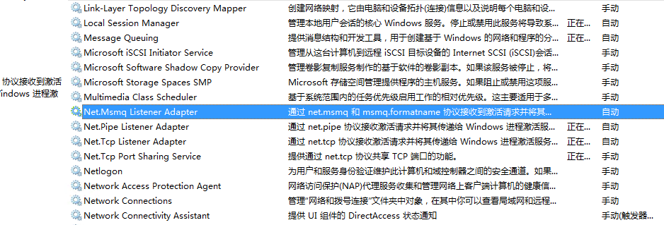 问题:SA前后台分离创建文件夹共享提示未创建服务器错误 解决方法: 进入服务控制台 找到Net.Msmq Listener Adapter 然后启动即可