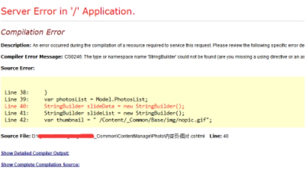 问题分析与解决办法:这个是图片类型的模板,1.81版本产品已经不允许在页面上调用 stringbuilder参数,所以这两个模板要按照产品的图片内容页进行调整,通过对比软件和默认内容页-图片.cshtml视图对比,修改为一致或者直接通过默认版本替换,就可以修复好改问题。