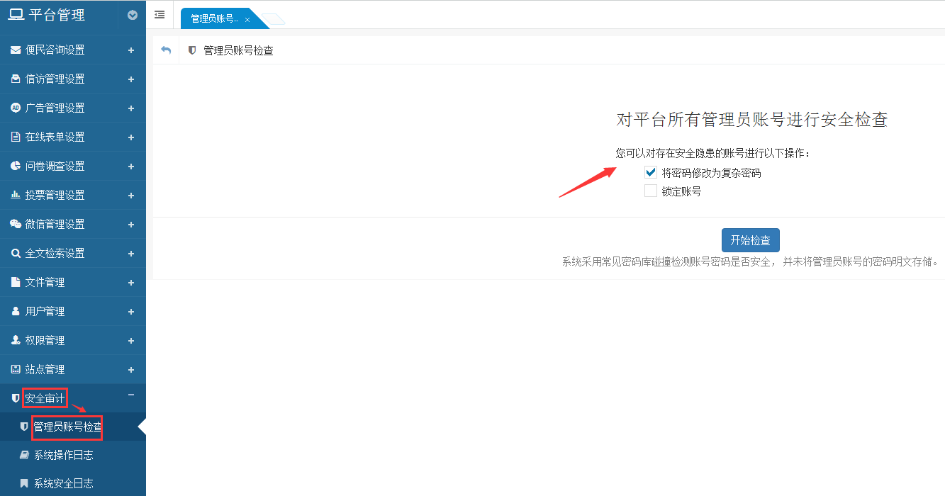 <p style="text-indent: 2em"> 问题描述:怎么检查管理员是否有弱口令密码?</p> <p style="margin-left: 40px">问题解决:平台中心可以对所有管理员账号进行安全检查,可选择对弱口令密码强制修改,或将弱口令管理员锁定。</p> <p style="text-indent: 2em"> </p> <p align="center"><img alt="" border="0" src="$/History/tech/uploadfiles/help/2018/3/201803291755222875.png" /></p>