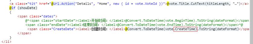(2)接下来还是在投票列表标签上找到如图所示代码,屏蔽或者删掉原来的开始时间和结束时间。写输出对应的创建时间代码,vote.CreateTime就是投票表的创建时间字段