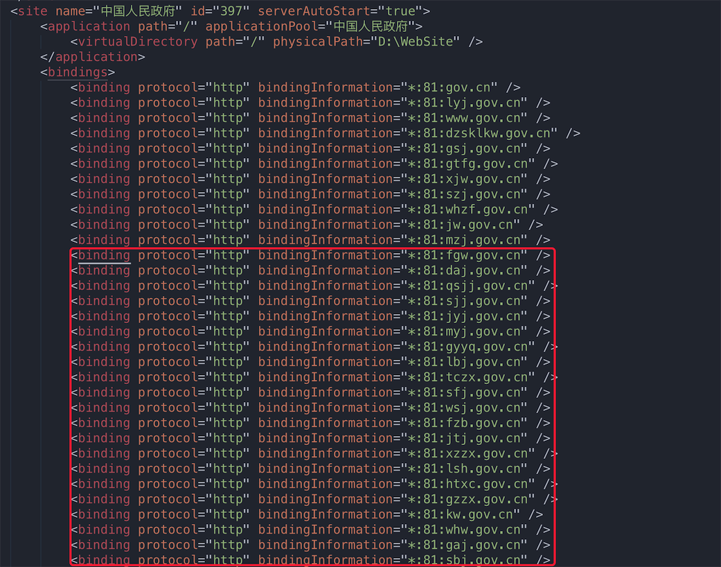 4.确认检查无误后开始复制粘贴到applicationHost.config文件中你所建站点的
