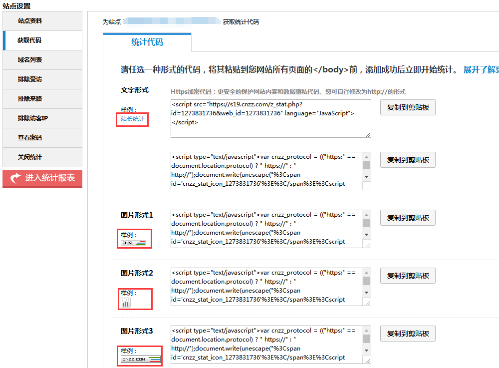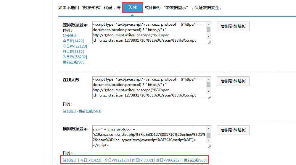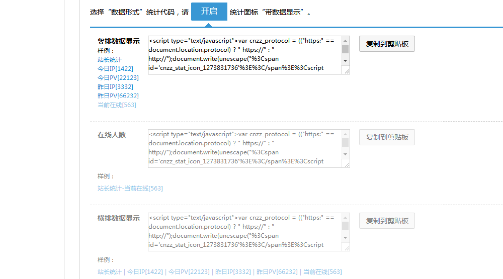 如果需要“数据形式”的统计代码,可点击【开启】按钮。