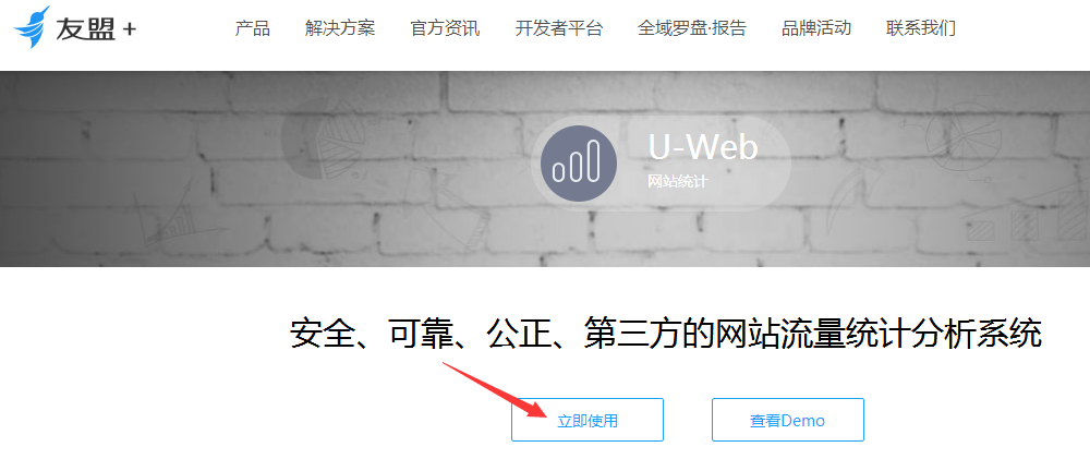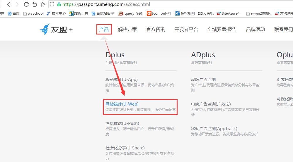 2、获取网站统计代码登录友盟,点击“产品”,选择“网站统计(U-Web)”