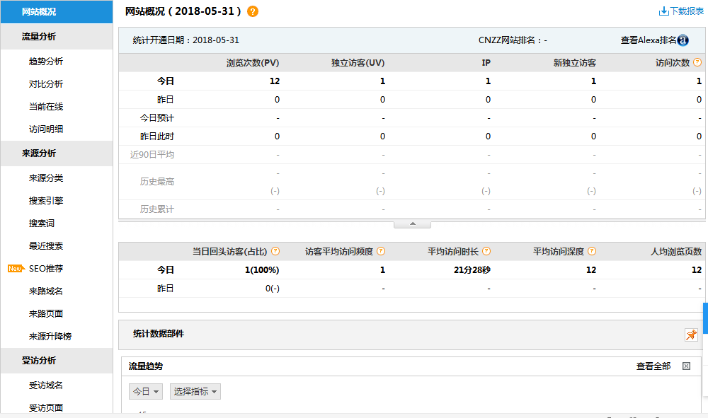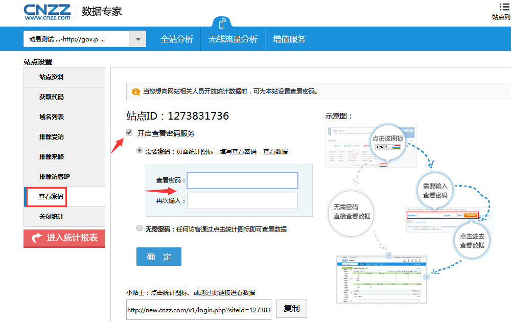 4、设置前台查看统计数据密码。前台“站长统计”带有链接可查看统计数据,如需密码访问,可设定固定密码。