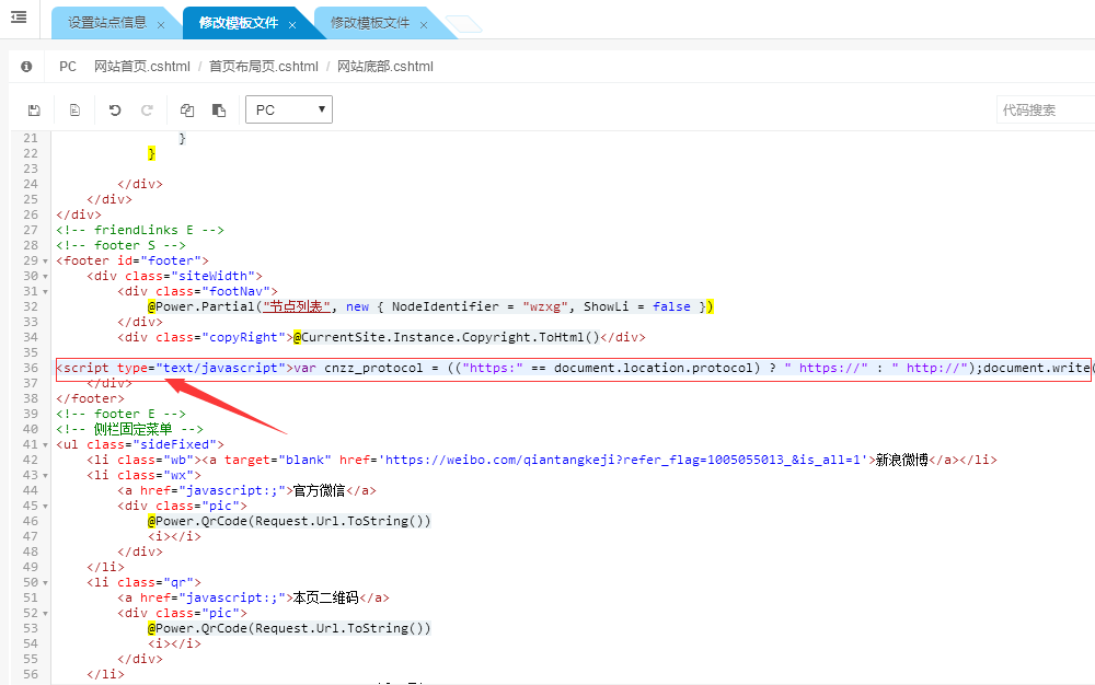3、将统计代码放到网站底部复制相应的统计代码,一般需要将统计代码放到页面底部,找到“网站底部”(以实际为准)视图文件,编辑,将代码放到适当位置处。