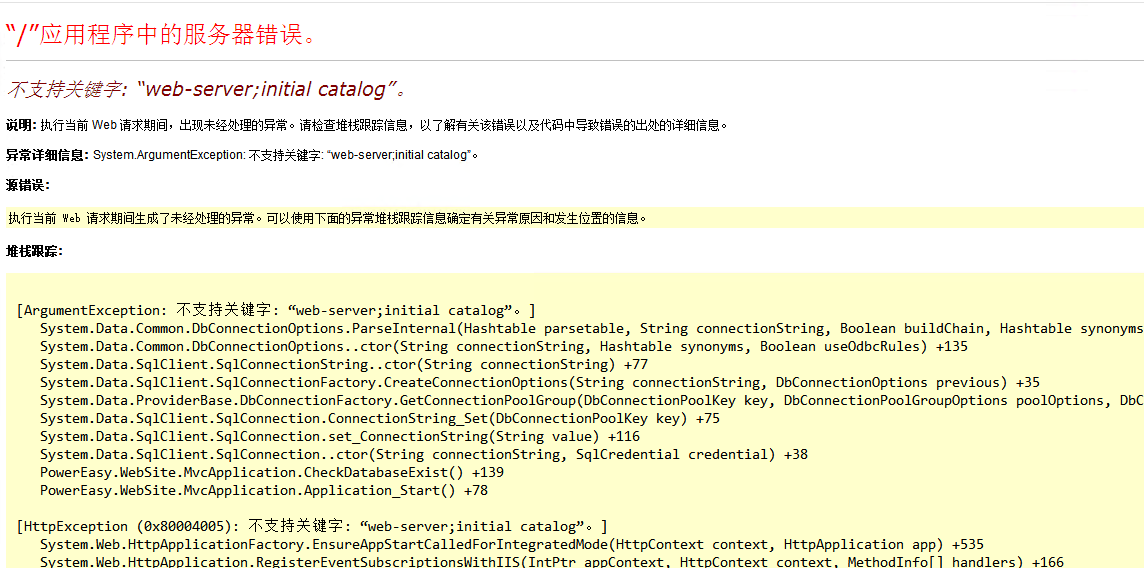 问题描述:新部署的SiteAzure,出现不支持关键字: “initial catalog”的报错。