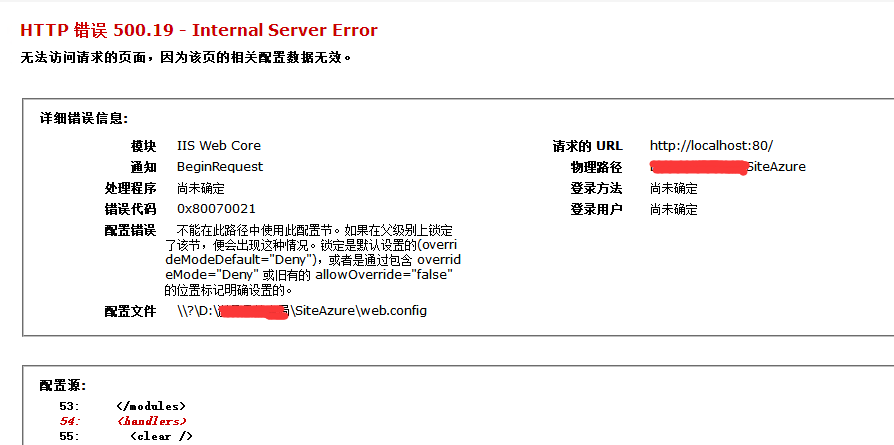 问题描述:安装部署好SiteAzure网站之后,报错500.19。