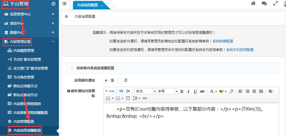 进入【平台中心】--【内容管理设置】--【内容消息提醒配置】启用邮件和短消息提醒,并配置相应模板。