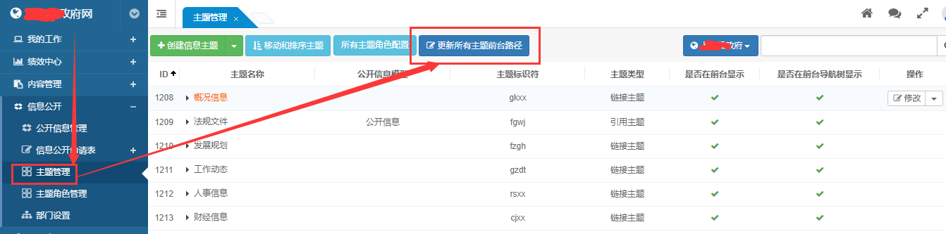 解决方案: 在站点里面,信息公开-主题管理-更新所有主题前台路径。
