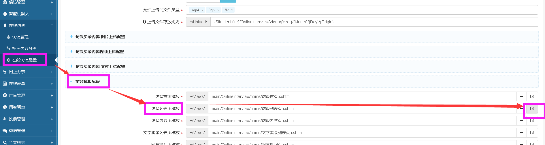 解决:后台“在线访谈”功能区,选择“在线访谈配置”——“前台模板配置”——“访谈列表页模板”,然后选择编辑。