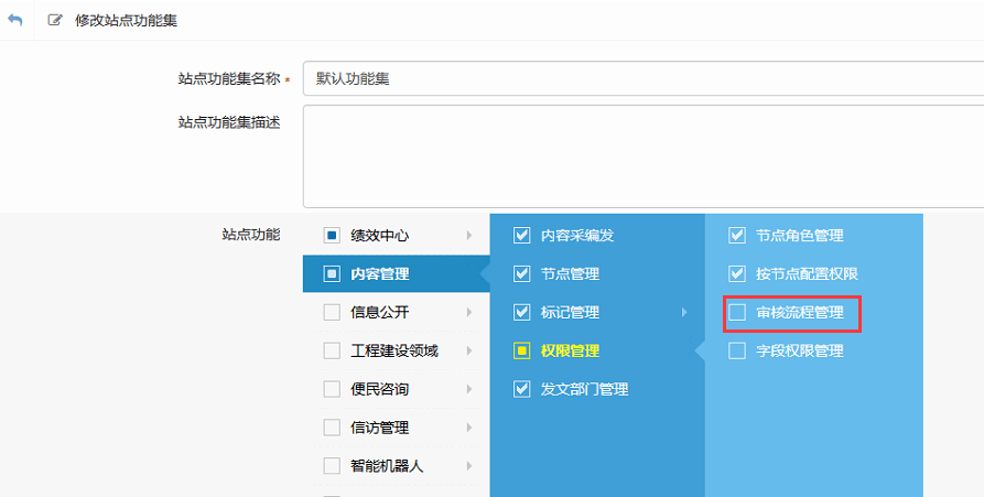 问题解决:首先排查此站点拥有哪个站点功能集,然后修改此功能集,给与“审核流程”功能模块。