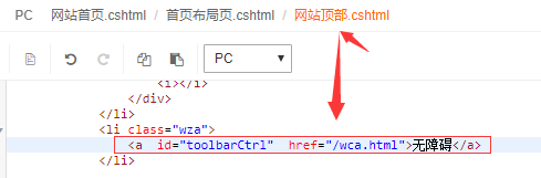 4.在网站首页上添加链接来访问“域名/wca.html”来打开无障碍辅助工具,与此同时,添加id属性为id="toolbarCtrl"。具体添加可参考下图(当然,也可以添加到其他的地方)